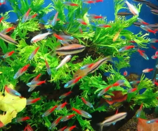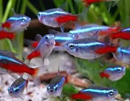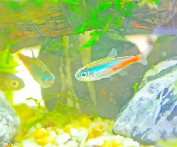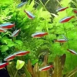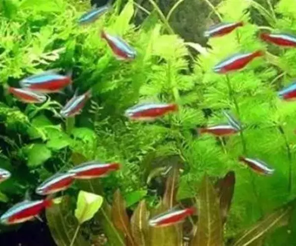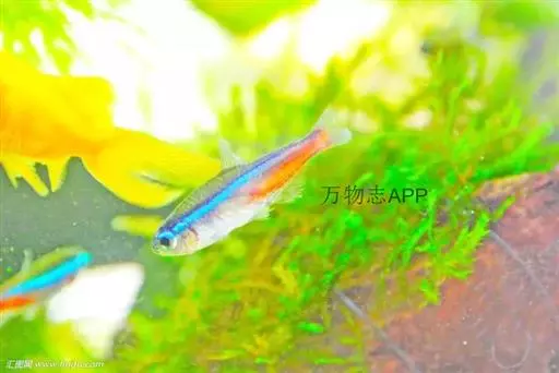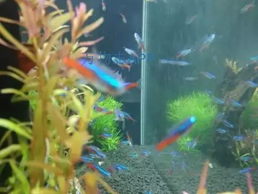 霓虹灯鱼又被称为红绿灯鱼、红莲灯鱼。鱼纲,脂鲤科(拟鲤科)。原产亚马孙河上游。体长3~4厘米,体形较细,色泽美丽,体上部的绿线,因光线角度不同,有时显出蓝色,与体下部的红线极为协调(后腹部至尾鳍基部为红色),又与腹部全红的新红绿灯鱼〔新红莲灯鱼;(Paracheirodon simulans)〕有明显差异。鱼性胆小,常在水上安静的环境下游动。喜食活水蚤,极易饲养。