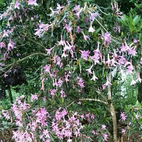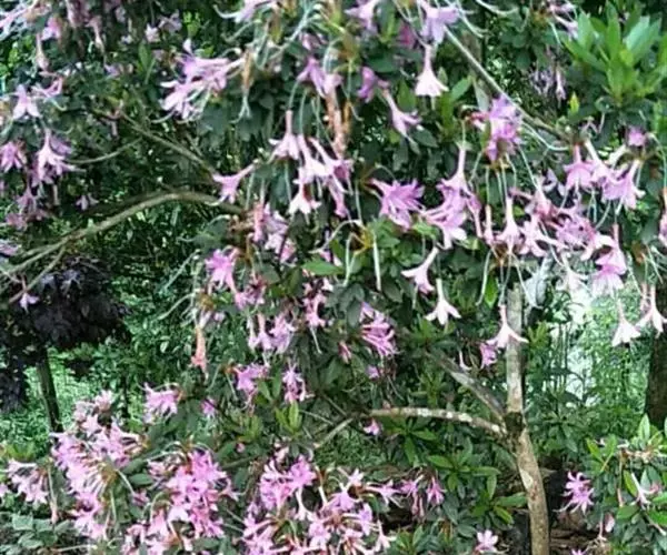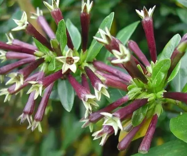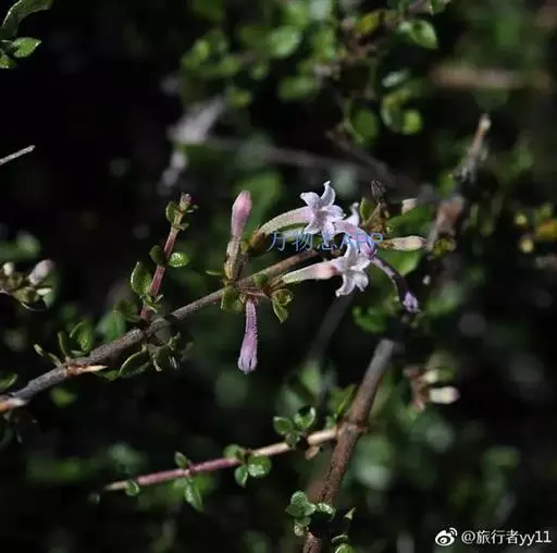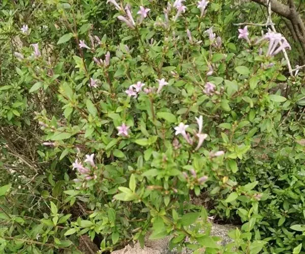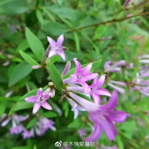 花无梗,常3-7朵簇生枝顶,很少在小枝上部腋生;小苞片透明,卵形,长约3毫米,外面被柔毛,约2/3至1/2合生,裂片近三角形,顶端有硬尖头,与萼近等长;萼裂片阔卵形,长约1.3-1.5毫米,顶端钝,边缘密生缘毛;花冠淡紫红色,漏斗状,长11-14毫米,有时可达20毫米,外面被微柔毛,冠管狭长,下部常弯曲,裂片狭三角形或披针形,长约2-4毫米,顶端内弯;短柱花雄蕊微伸出,花药线形,长柱花内藏,花药线状长圆形;花柱具4-5个线形柱头裂片,长柱花微伸出,短柱花内藏。蒴果长5-6毫米,种子有网状、与种皮分离的假种皮。花期6-8月,果期10月。