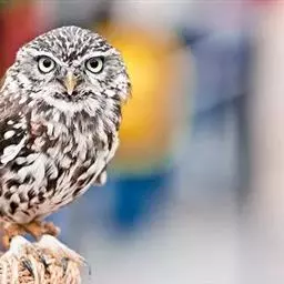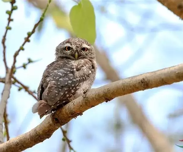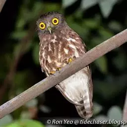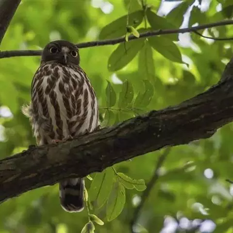 横斑腹小鸮(Athene brama):是鸱鸮科、小鸮属的一种鸟类。体长20厘米左右。面盘不明显,没有耳羽簇,皱领也不显著。跗蹠和趾被羽。上体为灰褐色至棕褐色,具白色斑点,尤以头顶较为细密,眉纹和两眼之间为白色,后颈具不完整的白色翎领。下体为灰色,没有条纹,两胁具横斑,所以得名,但腹的中部为纯白色,没有斑。虹膜金黄色。嘴角绿色,嘴峰有时较暗,有时较黄,蜡膜绿色或绿褐色,脚黄绿色,铅绿色或暗黄色。