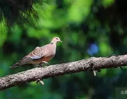 山斑鸠,是鸽形目鸽鸠科斑鸠属鸟类,又名金背斑鸠、棕背斑鸠、山鸠、金背鸠、麒麟斑、麒麟鸠、东方斑鸠、绿斑鸠、山鸽子。山斑鸠颈侧具明显黑白色条纹的块状斑,上体深褐色、具扇贝状斑纹,羽缘棕色,尾羽近黑色,下体多偏粉色。虹膜黄色,喙灰色,脚粉色。山斑鸠是留鸟,在中国常见且分布广泛。此外,还分布于不丹、尼泊尔、巴基斯坦、印度、日本等国。栖息于针阔混交林、季风常绿阔叶林、果园及农耕区,多成对活动于开阔农耕区、村舍、寺院周围及防火林带。取食于地面,主要觅食植物种子、果实、嫩芽等,也吃昆虫。山斑鸠飞翔时鼓翼快速,叫声为反复而低沉的“咕咕咕”声。繁殖期在4-7月,营巢于林中树上,通常一年繁殖2窝,窝卵数2枚,由雌雄亲鸟轮流孵卵,孵化期18~19天。山斑鸠的肉、卵可食,肉入药可益气明目、强筋壮骨,治久病气虚、衰弱无力、两目昏暗等病症。山斑鸠啄食杂草种子,对农田清除杂草有益;但有时也刨食农作物及树的种子。山斑鸠