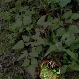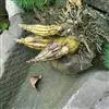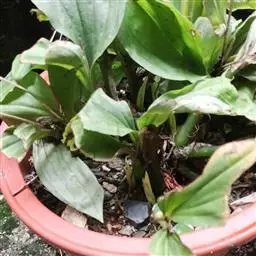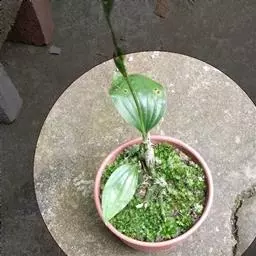 方法一 准备好兰盆及植料后,将兰株倒拿(根在上,叶在下)放于水龙头下以慢水冲洗,但水压切忌过强,以免伤兰根及叶子。用拇指和食指抓住兰头,小指抵住盆缘,用竹筷将根固定,当放入盆内时,尽量不要让根接触到盆壁。将豆粒大的混合石砾倒入盆底至三分之一处。然后倒入中粒植料至五分之四处,填实和尽量不要留下空间。将竹筷拔出,并摇实盆中植料。填实植料后,再用大粒植料埴入至距盆缘1.5厘米处。最后再倒入豆粒大植料,以将假鳞茎全部埋入土中为度,然后充分摇实。用压土工具轻压植料,并将表面弄平。种植完毕后,植料在盆中以中央稍高为好。