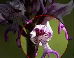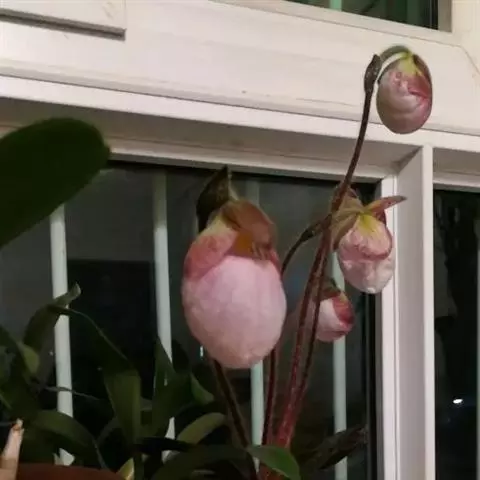 花瓣线形,黄绿色,长9-10毫米,宽1毫米,先端渐尖,具1脉;唇瓣位于上方,长椭圆状披针形、长椭圆状卵形或披针状卵形,大,长15-21毫米,宽5-7毫米,不裂,背面黄绿色,内面桔红色而具鲜红色斑点,近先端处略黄色,先端渐尖,基部圆形且呈浅囊状,内面有细毛;蕊柱粗短,长2毫米,粗2.8毫米;花粉团4个,成2对,黄色,粒粉质,长1.5-1.7毫米。花期5-6月。