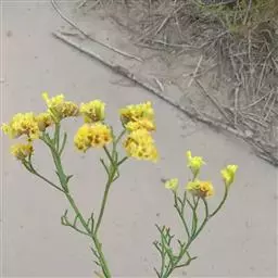 黄花补血草(学名:Limonium aureum (L.) Hill)是白花丹科补血草属多年生草本植物,高可达35厘米,全株无毛。茎基往往被有残存的叶柄和红褐色芽鳞。叶基生,长圆状匙形至倒披针形,先端圆或钝。花序圆锥状,花序轴绿色,穗状花序位于上部分枝顶端,外苞宽卵形,萼筒基部偏斜,萼檐金黄色,裂片正三角形,花冠橙黄色。6-8月开花,7-8月结果。