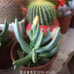 玉米石是景天科、景天属植物。多年生草本多浆植物。植株低矮丛生,多分枝。叶膨大成圆筒形、卵形或近小球形,…