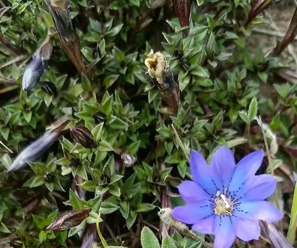 鳞叶龙胆(学名:Gentiana squarrosa Ledeb.)一年生草本,高2-8厘米。茎黄绿色或紫红色,密被黄绿色有时夹杂有紫色乳突,自基部起多分枝,枝铺散,斜升。叶先端钝圆或急尖,具短小尖头,基部渐狭,边缘厚软骨质,密生细乳突。花多数,单生于小枝顶端;花梗黄绿色或紫红色,密被黄绿色乳突、有时夹杂有紫色乳突,长2-8毫米,藏于或大部分藏于最上部叶中;花萼倒锥状筒形,蒴果外露,倒卵状矩圆形,长3.5-5.5毫米,先端圆形,有宽翅,两侧边缘有狭翅,基部渐狭成柄,柄粗壮,直立,长至8毫米;种子黑褐色,椭圆形或矩圆形,长0.8-1毫米,表面有白色光亮的细网纹。花果期4-9月。