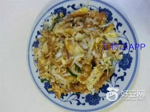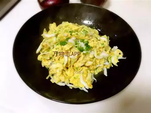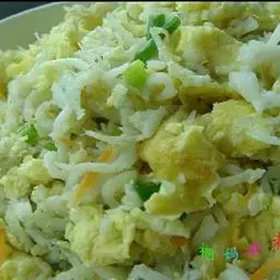 3、倒入留有余油的炒锅中,待蛋液稍凝固下银鱼一起翻炒,撒葱花即可。