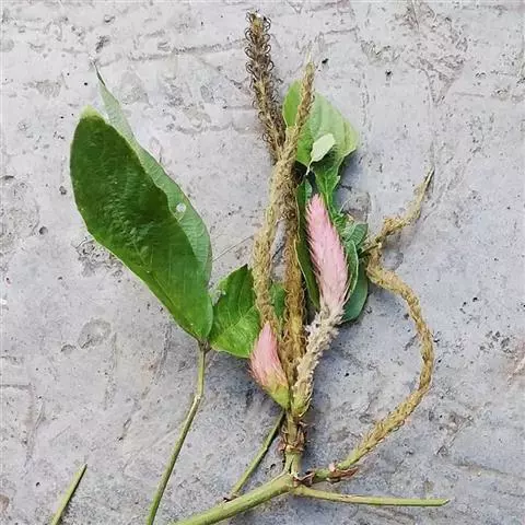 葛〔拉丁学名:Pueraria lobata(Willd.)Ohwi〕:豆科,葛属多年生草质藤本植物,块根肥厚圆柱状,叶互生,项生叶片菱状卵圆形,总状花序,腋生,蝶形花冠,紫红色。荚果长条形,扁平,密被黄褐色硬毛。7-8月开花,8-10月结果。