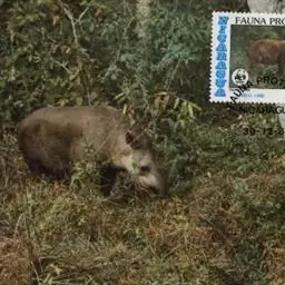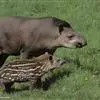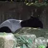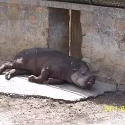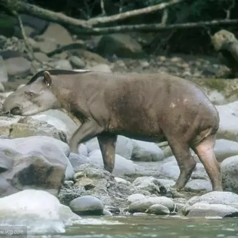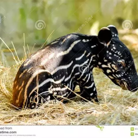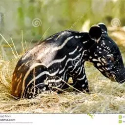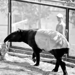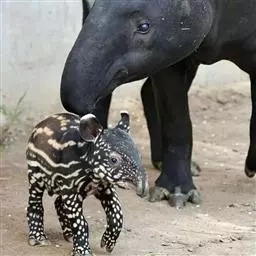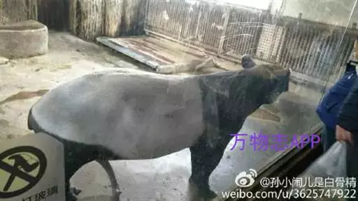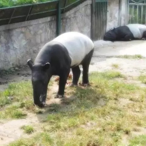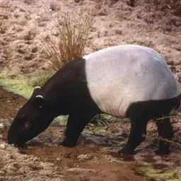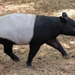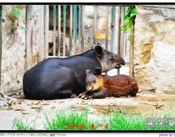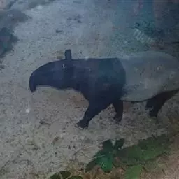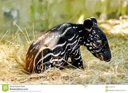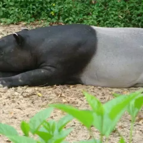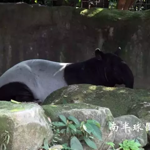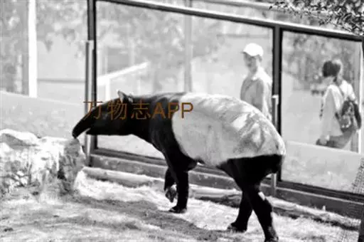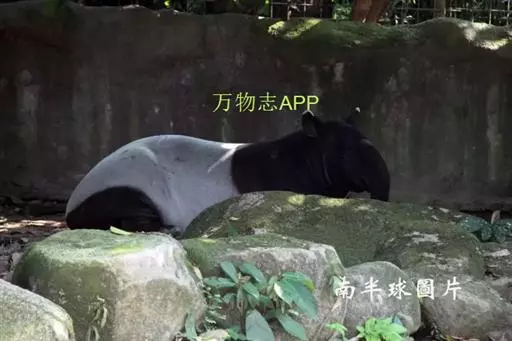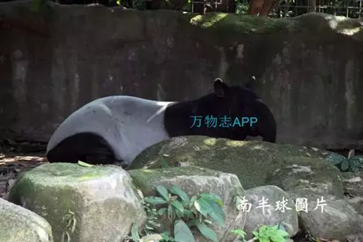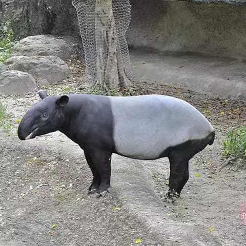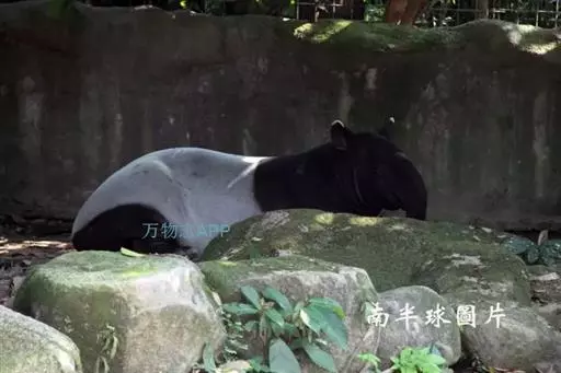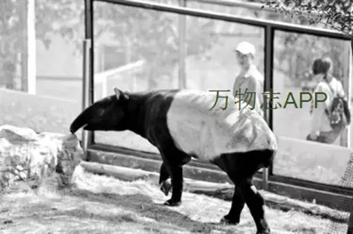 亚洲貘(学名:Tapirus indicus):亦称马来貘,是貘类中最大的一种,体长为1.8-2.5米,肩高90-120厘米,尾长5-10厘米,体重250-540千克。又叫五不像,它的鼻似象,耳似犀,尾似牛,足似虎,躯似熊,全身毛色黑白相间。长相十分奇特而有趣,一副呆头呆脑的样子,身体滚圆而肥壮,皮肤很厚,头部比猪大得多,脖子粗壮,鼻吻部延长、突出呈圆筒形,柔软而下垂,雌性比雄性大一点