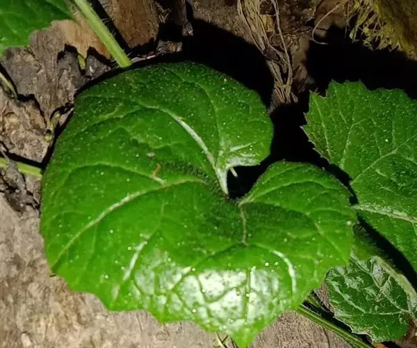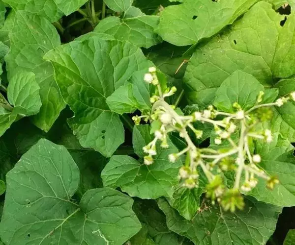 根状茎匍匐,直径1—1.5厘米,自节上生出多数的纤维根。茎直立,高30—100厘米,中部以上分枝,稀自基部分枝,分枝纤细、斜上,或基部的分枝粗壮,被蛛丝状绒毛,有长2—4厘米的节间。根生叶或有时下部的茎叶花期凋落;下部茎叶肾形或圆肾形,长(3)5—8厘米,宽(4)7—12厘米,基部心形,顶端急尖或钝,边缘有不等形的波状大牙齿,齿端有突尖,叶上面沿脉被尘状柔毛,下面密被蛛丝状毛,基出三脉,叶柄长5—17厘米,宽0.3—1厘米,有狭或较宽的翼,翼全缘或有不规则的钝齿;中部茎叶三角状圆形,长7—13厘米,宽8—14厘米,向上的叶渐小,三角状卵形或菱状倒卵形,最上部的叶长约1厘米,披针形或线状披针形,无柄,全缘。头状花序排成狭或宽大的圆锥状花序,花梗短,被白色绒毛,花后花梗伸长,长2—6厘米,密被稠密头状具柄腺毛。总苞半球形,宽2.5—5毫米;总苞片5—7个,宽卵形,长2—3.5毫米,全缘,果期向外反曲。雌花白色,长1.5毫米,檐部比管部长,裂片卵状长椭圆形,两性花淡白色,长2毫米,檐部短于管部2倍。瘦果棍棒状,长6—8毫米,被多数头状具柄的腺毛。花果期6—11月