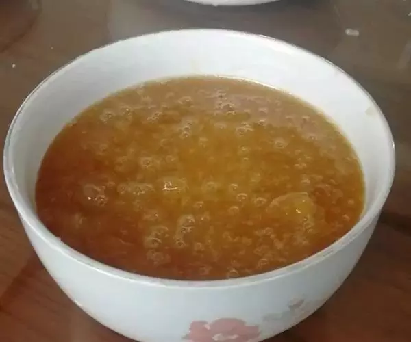 2、将南瓜粉搅匀放粥内,续煮20分钟,加入冰糖调味。