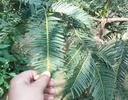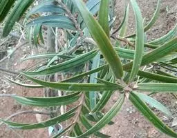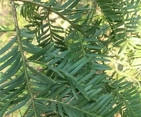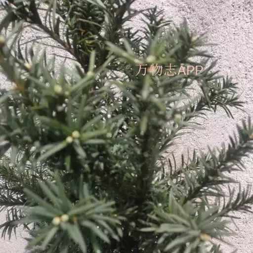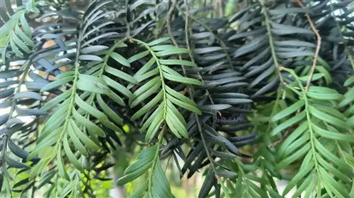叶排列成两列,条形,微弯或较直,长1-3(多为1.5-2.2)厘米,宽2-4(多为3)毫米,上部微渐窄,先端常微急尖,稀急尖或渐尖,上面深绿色,有光泽,下面淡黄绿色,有两条气孔带,中脉带上有密生均匀而微小的圆形角质乳头状突起点,常与气孔带同色,稀色较浅。