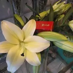 切花的采收、贮存和运输通常在茎上最低的一个花蕾充分着色时采收。剪花最好在早晨进行。麝香百合的花蕾膨大而呈乳白色时为采收适期,一般是开花前的1-2天采收。花枝剪下后按照花蕾数目、花茎长度和坚硬度进行分级,去掉下部10cm的叶子,每10支扎成一束。为了防止脱水,整个加工过程最多能持续1h。为了不影响种球的生长,要给植株留下足够的茎叶。不能立即运出的切花应于冷藏室中存放,插入水中,温度控制在2一3 0C,可贮藏1周。廖香百合切花运输时应装在有孔的盒子里,防止开放的花朵产生高浓度的乙烯,造成花萎蔫和落蕾。最好使用保温车,温度控制在2一3℃。 已开的花朵,包装时花瓣容易损伤,同时花粉易造成花瓣污染,使切花品质大为下降。因此,如遇已开的花朵,最好小心将花药剪掉。