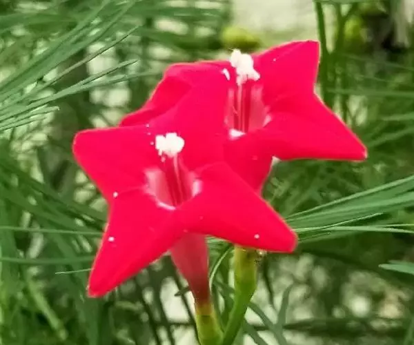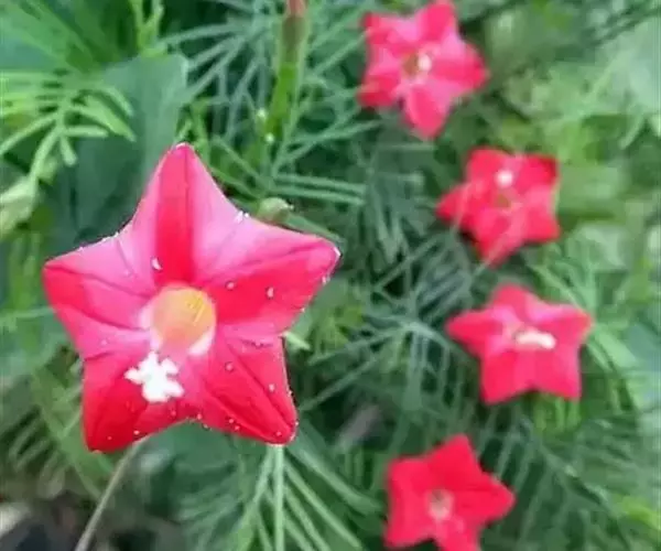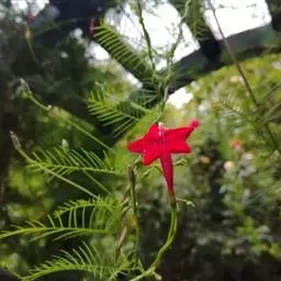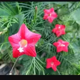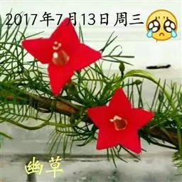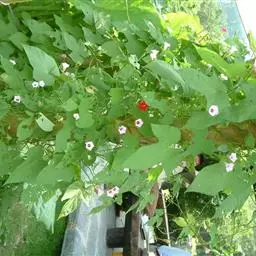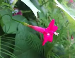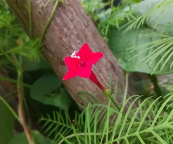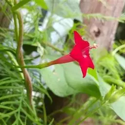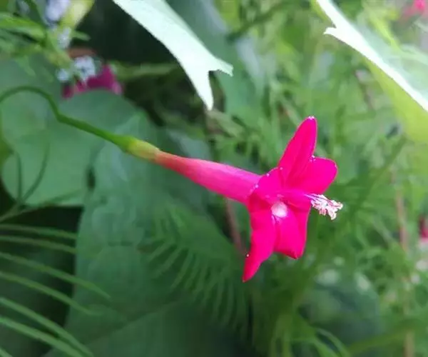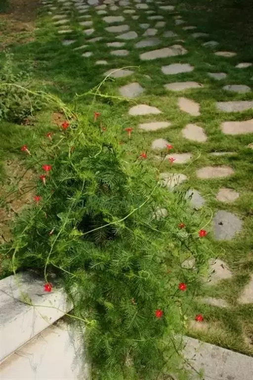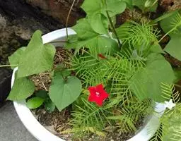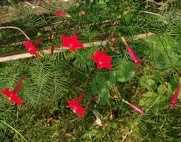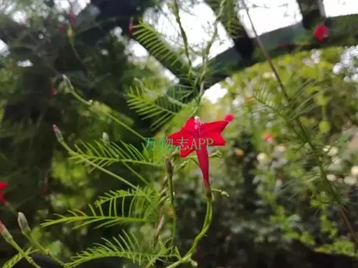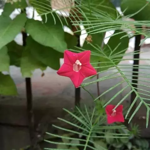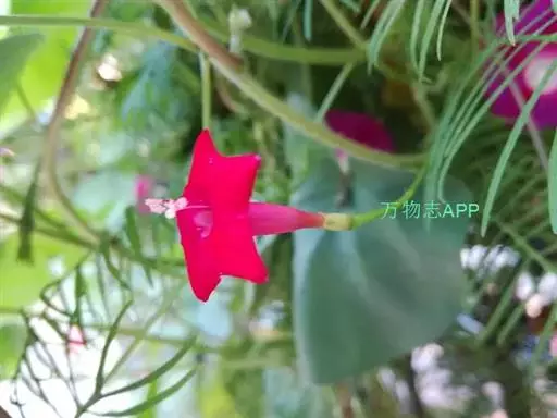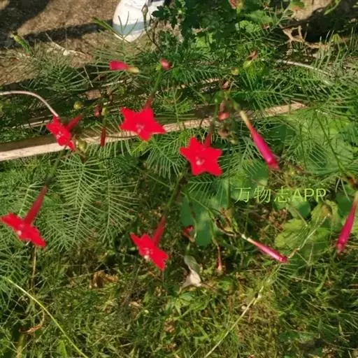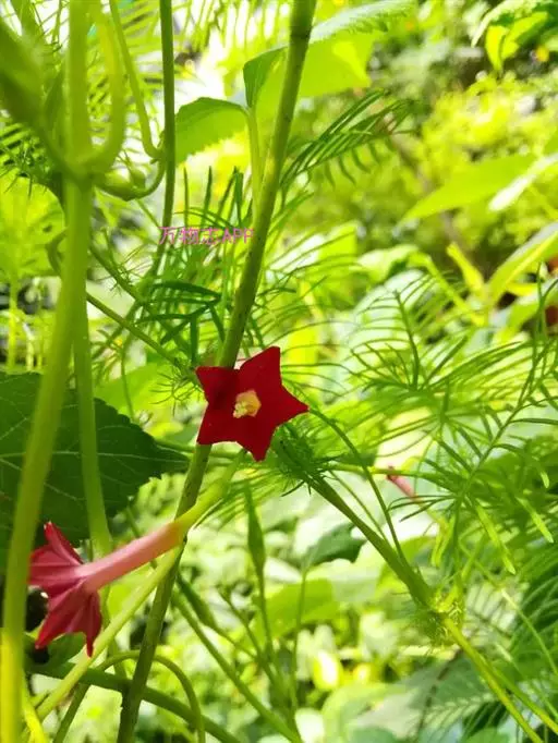1年生草质藤本植物。茎细长柔软光滑。叶羽状细裂,茂密细腻。小花高脚碟形,花色鲜红、深红或白色,点点铺撒在绿色叶丛中,清丽诱人,花期7—10月。果成熟黑色,易脱落,应及时采收。