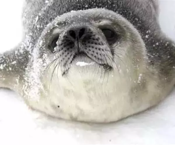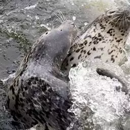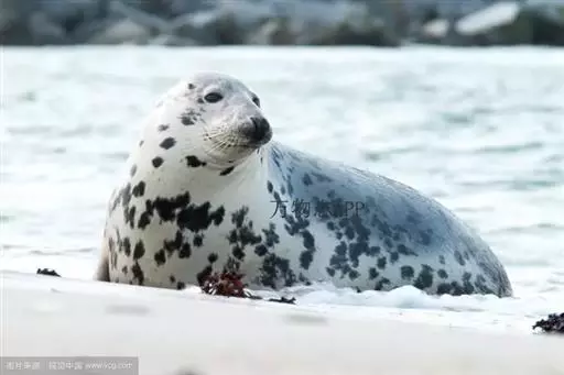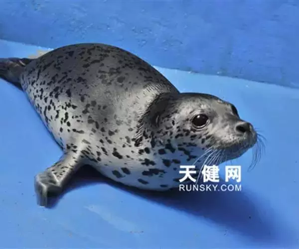 斑海豹的身体肥壮而浑圆,呈纺锤型,体长约1.2~2米,体重约100公斤,全身生有细密的短毛,背部灰黑色 水中的斑海豹 并布有不规则的棕灰色或棕黑色的斑点,腹面乳白色,斑点稀少,雄兽略大于雌兽。头圆而平滑,眼大,吻短而宽,唇部触口须长而硬,呈念珠状,感觉灵敏,是它觅食的武器之一。没有外耳廓,也没有明显的颈部,四肢短,前后肢都有五趾(指),趾间有皮膜相连,似蹼状,形成鳍足,指、趾端部具有尖锐的爪。前肢狭小,后肢较大而呈扇形,其趾外侧长而内侧短,尾短小,仅有7~10厘米长,夹于后肢之间,联成扇形。前肢朝前,后肢朝后,不能弯曲,游泳的姿势就像人伸开手脚俯卧的样子,这种体型十分适宜在大海中游泳。