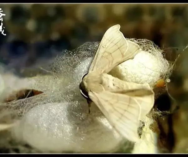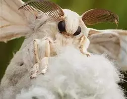 鳞翅目(Lepidoptera)蚕蛾科(Bombycidae)家蚕属(Bombyx) 蚕蛾 昆虫,驯养以取其丝。养蚕业历史悠久,原产于中国的家蚕已引到世界各地,并已驯化。成蛾翅展40~50公釐(约2吋),体粗壮多毛,寿命只2~3天,不取食,也很少飞行。产卵约300~500粒。幼虫(蚕)白色,无毛,具特征性的尾棘;主要以桑叶为食,有时亦食桑橙或莴苣的叶;生长45天後最长可达75公釐(约3吋)。幼虫成熟後吐出一条连续的长约915公尺(1,000码)的丝,结成一茧,在其中化蛹。为取用其丝,人们用热空气或蒸汽杀死其蛹,并保持其丝的完整性。
