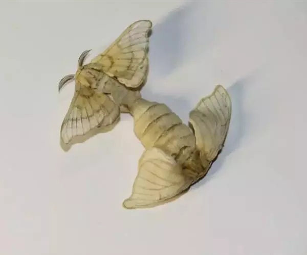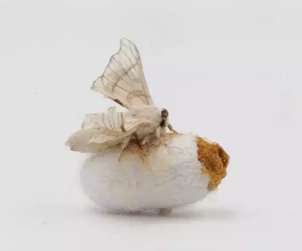 蚕蛾的形状像蝴蝶,全身披着白色鳞毛,但由于两对翅较小,已失去飞翔能力。蚕蛾的头部呈小球状,长有鼓起的复眼和触角;胸部长有一对胸足及两对翅;腹部已无腹足,末端体节演化为外生殖器。雌蛾体大,爬动慢;雄蛾体小,爬动较快,翅膀飞快地振动,寻找着配偶。一般交尾3~4小时后,雌蛾就可产下受精卵。蚕蛾(成虫)留下后代,不久之后便会死去。蚕蛾产下的卵→孵蚕→变蛹→化蛾,又将完成新一代的循环。这就是蚕的生命史。