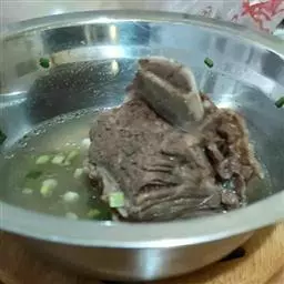 3、将汤锅置火上,放入清水2500克,烧沸,放入生姜1克、葱结2.5克,八角0.5克,改用微火,将鸭腿朝上,头朝下放入锅内,盖上锅盖焖约20分钟后,改中火待锅边起小泡时,揭开锅盖,提起鸭腿,将鸭腹中的汤汁沥入锅内,复将其揿入汤中,使鸭腹内灌满热汤,如此反复3-4次后,再用微火焐约20分钟取出,抽去芦管,沥去汤汁,冷却后斩成块整齐地装入盘中即成。