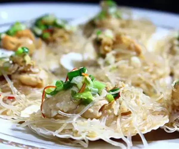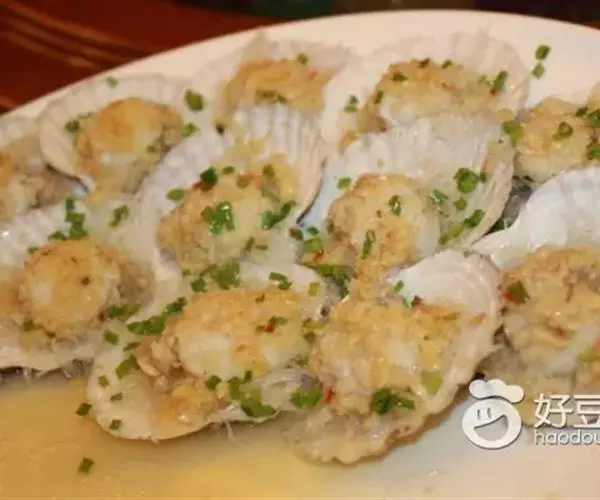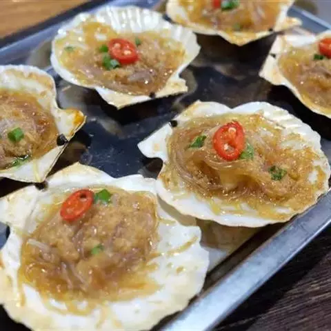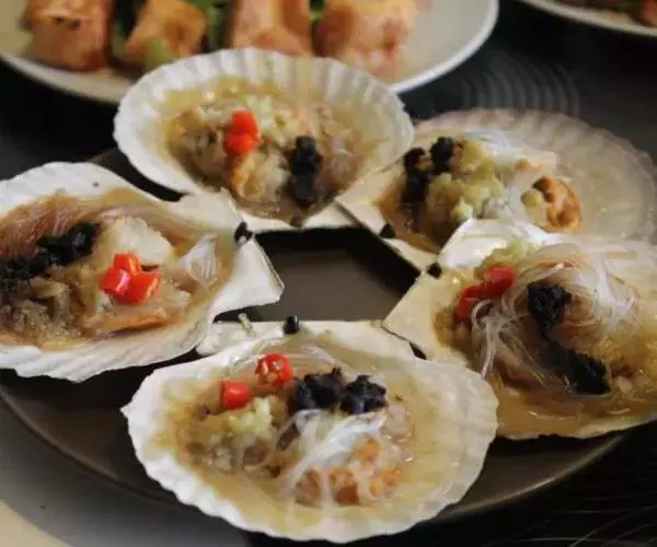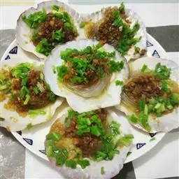 豉汁扇贝,山东威海著名的特色小吃,做法简单,咸鲜味十足。扇贝放在装有清水的盆里泡上一个小时;然后用刷子刷干净外壳;把扇贝用小刀撬开,把内脏及腮去除;把用温水泡软的粉丝放到扇贝上;大蒜成蒜蓉;在炒锅里放油把蒜蓉炒出香味盛出;趁热把蒜蓉油分别放在每个扇贝的粉丝上面;在扇贝上均匀的浇上蒸鱼豉油;蒸锅水开后放入扇贝,蒸八分钟即可;出锅后放上些香葱碎做点缀。