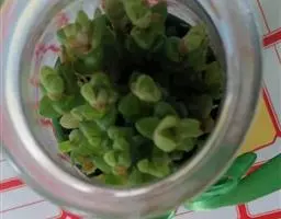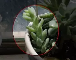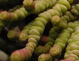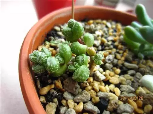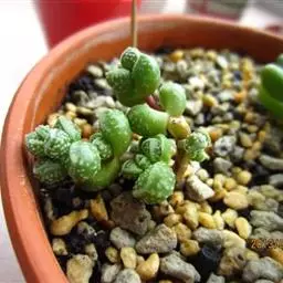 红数珠是景天科青锁龙属植物,叶片对生,叶片长圆型,叶片肥厚。叶片表面有不规则凸起的白色颗粒,就象面包的表面撒了白色的佐料一样。红数珠花开乳白色,五角型的花瓣。