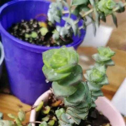 红稚儿Crassula pubescens subsp. radicans Toelken为景天科、青锁龙属多肉植物。植株丛生,有细小的分枝,茎肉质,时间养久了茎会逐渐半木质化,红稚儿叶片有点薄,叶片颜色绿。颜色反差巨大,平时为绿色,日照充足的春秋季节,变为火红色。野外分布于南非东开普省布什维德谷。喜温暖干燥和阳光充足的环境,怕低温和霜雪,耐半阴。叶形叶色较美,有一定的观赏价值;盆栽可放置于电视、电脑旁,可吸收辐射,亦可栽植于室内以吸收甲醛等物质,净化空气。