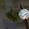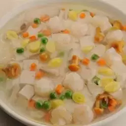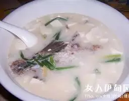 3、把米豆腐放入烫水中加热,2分钟即可捞出,放入配汤中,再在米豆腐中加少量的葱,使其香味更浓。