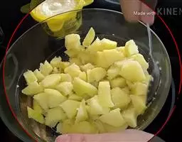 1、把冷却好的米豆腐用刀或网状工具(专门用来切米豆腐的一种自制工具,把横竖等分的细线织成网状固定在木框架上而成)切成长宽高各1厘米左右的粒状,放入置有清水的盆中,这样它不易碎散。