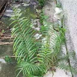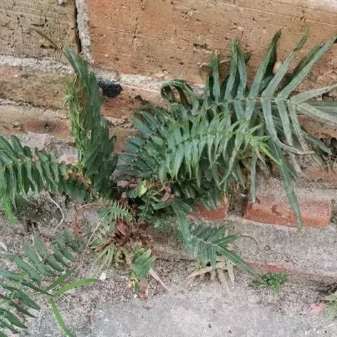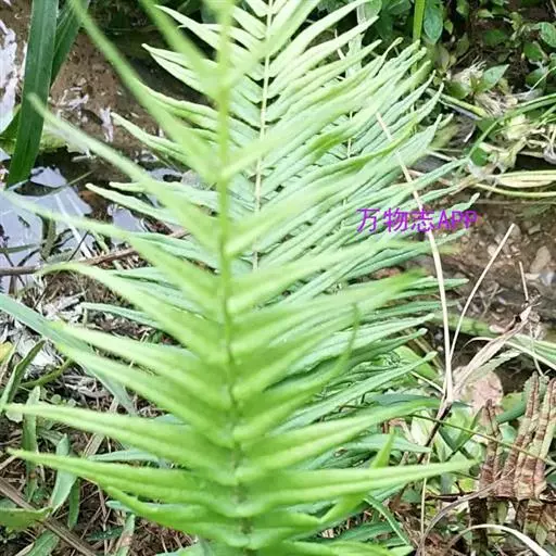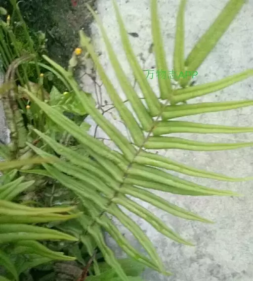 蜈蚣草(学名:Pteris vittata L.,)是凤尾蕨科,凤尾蕨属陆生蕨类植物。植株高可达150厘米。根状茎直立,短而粗健,木质,密蓬松的黄褐色鳞片。叶簇生;柄坚硬,深禾秆色至浅褐色,叶片倒披针状长圆形,一回羽状;顶生羽片与侧生羽片同形,互生或有时近对生,中部羽片最长,狭线形,不育的叶缘有微细而均匀的密锯齿,几乎全部羽片均能育。