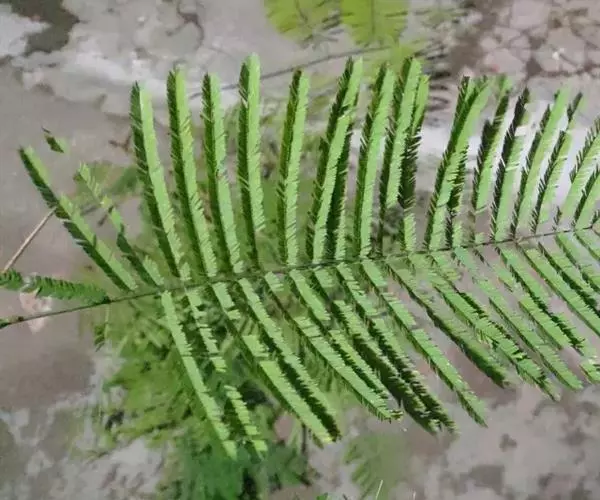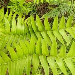 叶簇生;柄坚硬,长10-30厘米或更长,基部粗3-4毫米,深禾秆色至浅褐色,幼时密被与根状茎上同样的鳞片,以后渐变稀疏;叶片倒披针状长圆形,长20-90厘米或更长,宽5-25厘米或更宽,一回羽状;顶生羽片与侧生羽片同形,侧生羽多数(可达40对),互生或有时近对生,下部羽片较疏离,相距3-4厘米,斜展,无柄,不与叶轴合生,向下羽片逐渐缩短,基部羽片仅为耳形,中部羽片最长,狭线形,长6-15厘米宽5-10毫米,先端渐尖,基部扩大并为浅心脏形,其两侧稍呈耳形,上侧耳片较大并常覆盖叶轴,各羽片间的间隔宽约1-1.5厘米,不育的叶缘有微细而均匀的密锯齿,不为软骨质。主脉下面隆起并为浅禾秆色,侧脉纤细,密接,斜展,单一或分叉。叶干后薄革质,暗绿色,无光泽,无毛;叶轴禾秆色,疏被鳞片。在成熟的植株上除下部缩短的羽片不育外,几乎全部羽片均能育。