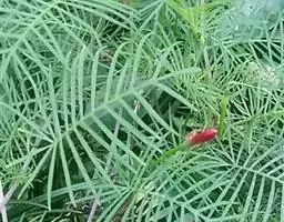 播种于草炭土上:蜈蚣草孢子直接播种到草炭土中,并保持湿润,20天左右可以看到原叶体。自然播种形成的孢子体长势比较健壮,移栽到花盆2个月后统计成活率为96%。