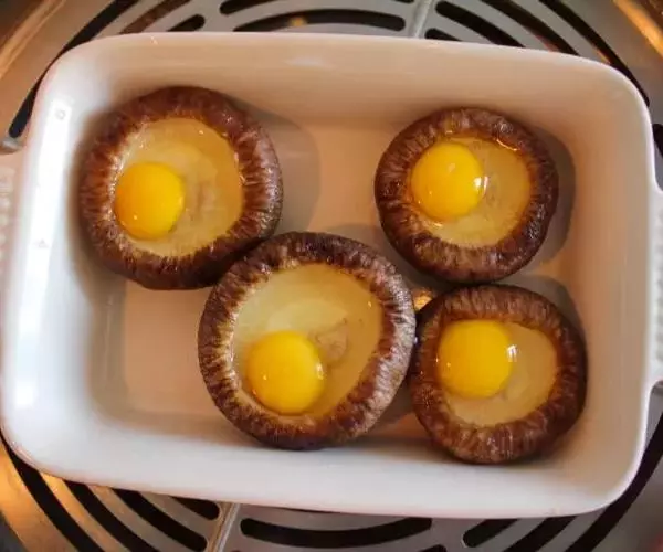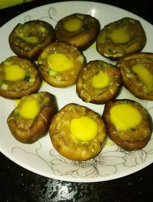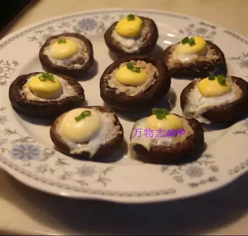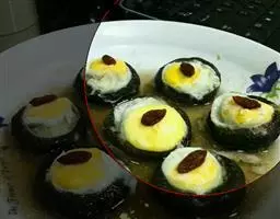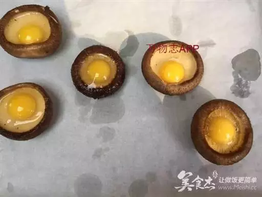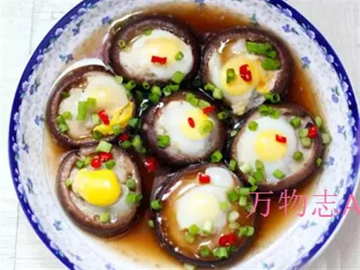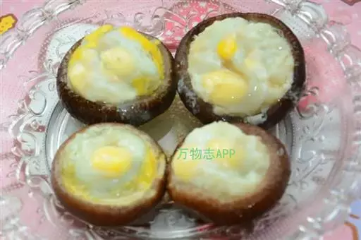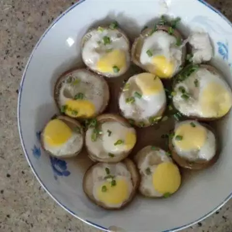 2、然后将鹌鹑蛋打到香菇盖中,装盘待用;将装盘的香菇鹌鹑蛋放入蒸锅中,大火烧开,然后转小火蒸10分钟;
