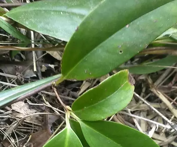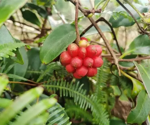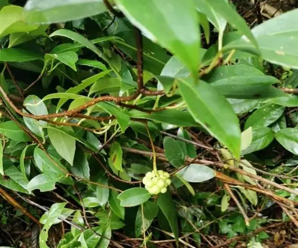 南五味子系藤本植物,各部无毛。叶长圆状披针形、倒卵状披针形或卵状长圆形,长5-13厘米,宽2-6厘米, 南五味子 先端渐尖或尖,基部狭楔形或宽楔形,边有疏齿,侧脉每边5-7条;上面具淡褐色透明腺点,叶柄长0.6-2.5厘米。