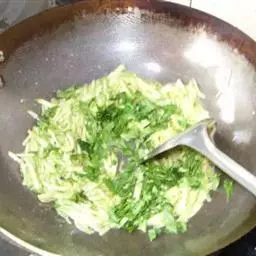 4 油锅放油,把韭黄放进锅里煸炒。