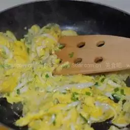 5 煸炒到韭黄变软,将炒好的鸡蛋倒入锅中一起煸炒。