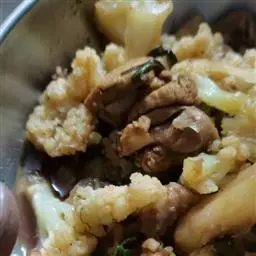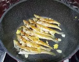 3 将煎熟的鸡蛋用锅铲弄碎后盛起待用。