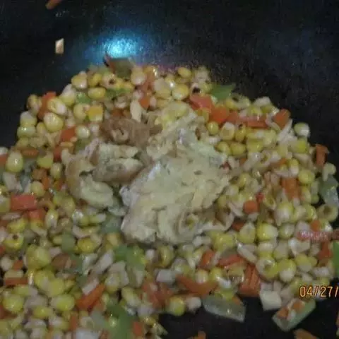 10加入大蒜瓣儿,翻炒泡好的大米。
