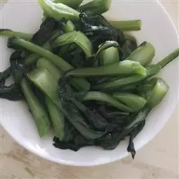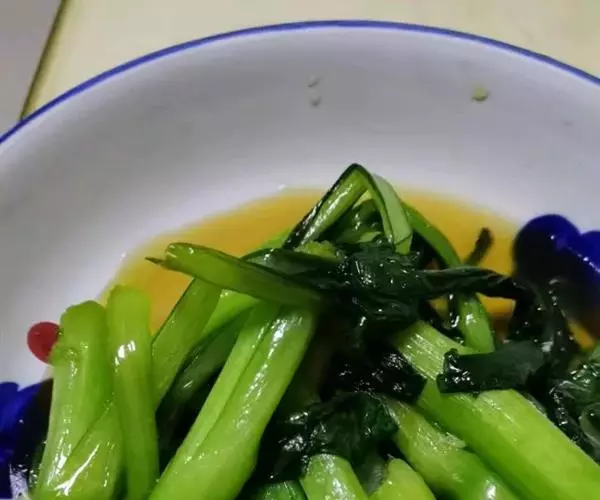 白灼菜心 调味料:蚝油1勺半、生抽1勺、盐适量、油适量。