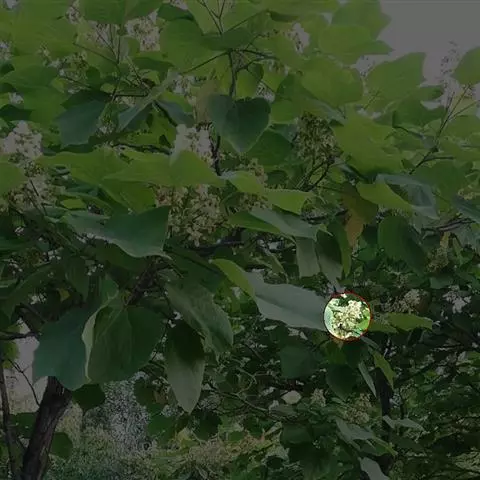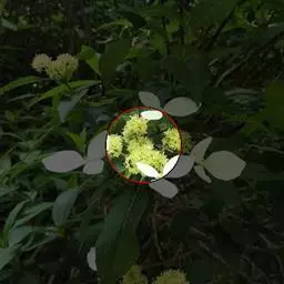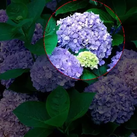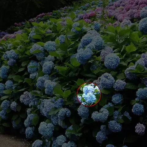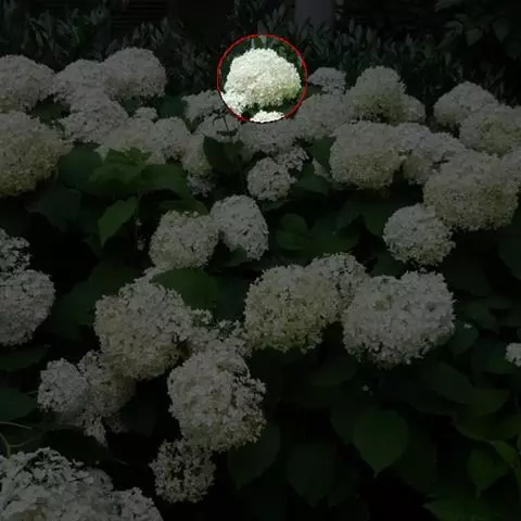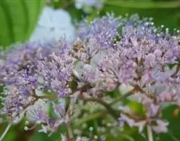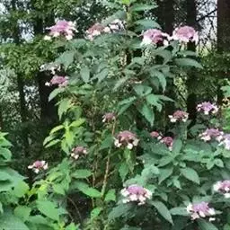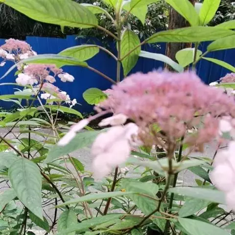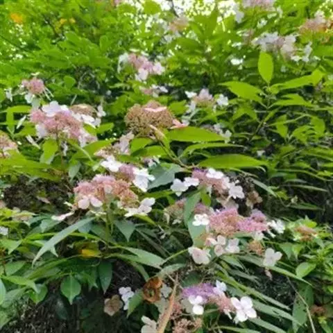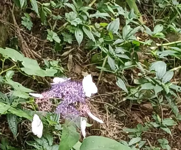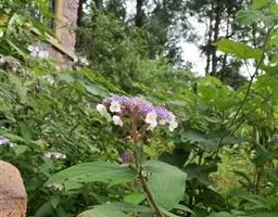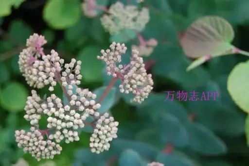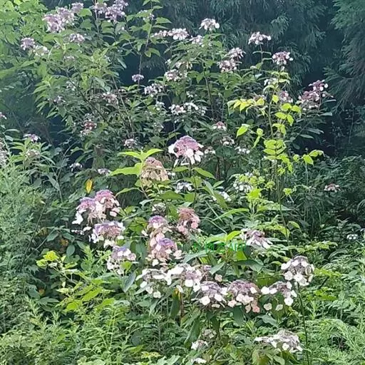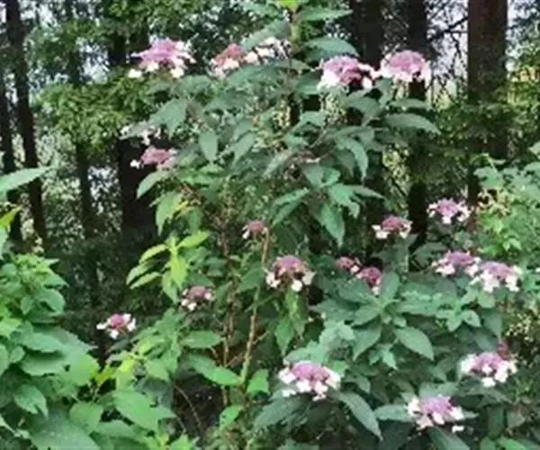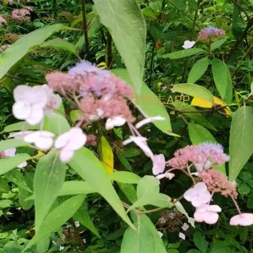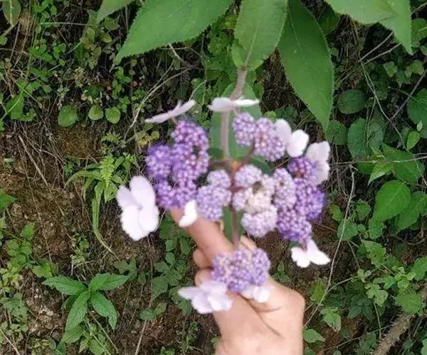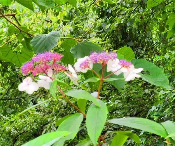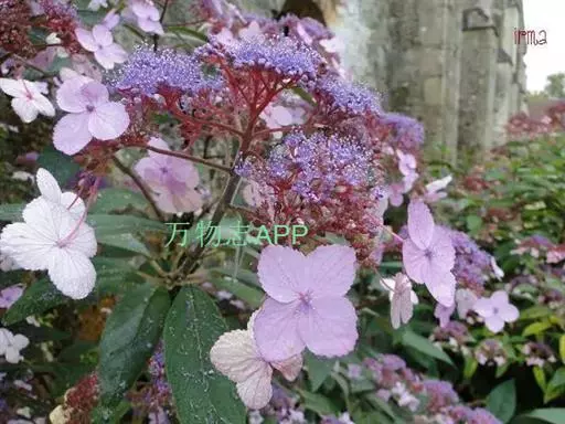 伞房状聚伞花序大,直径达28厘米,顶端稍拱,分枝扩展,密被灰白色糙伏毛;不育花萼片4-5,阔卵形、阔椭圆形或近圆形,结果时长1.3-2.7厘米,宽1.1-2.5厘米,先端钝头渐尖或近截平,基部具爪,边全缘或具数齿,白色或淡紫红色;孕性花淡紫红色,萼筒钟状,长约2毫米,萼齿三角形,长约0.5毫米;花瓣长卵形,长2-2.5毫米,初时顶端稍连合,后分离,早落;雄蕊不等长,较长的长约6毫米,较短的长约3毫米,花药长圆形,长约0.5毫米;子房下位,花柱2,结果时长约2毫米,近棒状,直立或外弯。