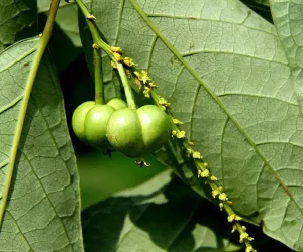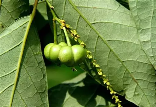雄花:花梗丝状,长1-2毫米;苞片在花序下部的比花序上部的略长,卵形至卵状披针形,长2-2.5毫米,宽1-1.2毫米,顶端短尖至渐尖,边缘有不规则的小齿,基部两侧各具1近长圆形的腺体,每一苞片内有3-4朵花;花萼杯状,3裂,裂片有不规则的小齿;雄蕊3枚,稀2枚,常伸出于花萼之外,花药球形,略短于花丝。雌花:花梗粗壮,长6-10毫米;苞片3深裂几达基部,裂片披针形,长2-3毫米,通常中间的裂片较大,两侧之裂片其边缘各具1腺体;萼片3,三角形,长和宽近相等,顶端短尖或有时钝;子房卵球形,平滑,3室,花柱基部合生,柱头3,外卷。蒴果三棱状球形,直径10-15毫米。分果爿脱落后无宿存中轴;种子扁球形,直径6-9毫米,无蜡质的假种皮,有雅致的棕褐色斑纹。花期5-6月。