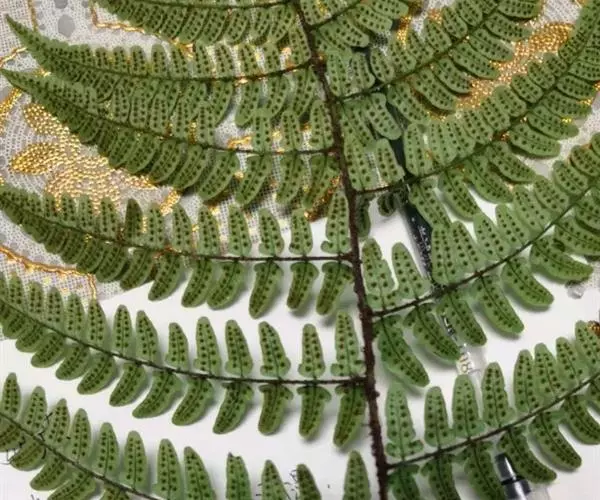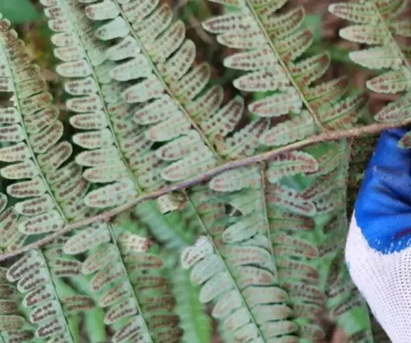孢子及孢子萌发:阔鳞鳞毛蕨孢子囊群小,生于小脉下部,圆形黄棕色。温暖干燥的环境下,孢子囊成熟后自行开裂释放出孢子。孢子黄褐色,圆形,周壁具皱褶,单裂缝;播种10天后从孢子壁的单裂缝处伸出一条无色透明的初生假根,标志着孢子萌发。孢子萌发类型为书带蕨型。