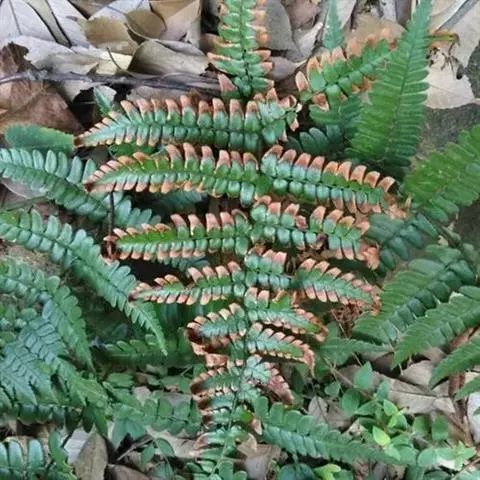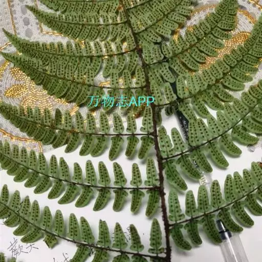 陆生中型蕨植物。 株高约50-80厘米。根状茎横卧或斜升,顶端及叶柄基部密被披针形、棕色、全缘的鳞片。叶簇生;叶柄长约30-40厘米,粗达4-5毫米,禾秆色,密被鳞片;鳞片阔披针形,顶端渐尖,边缘有尖齿;叶片卵状披针形,长约40-60厘米,宽约20-30厘米,二回羽状,小羽片羽状浅裂或深裂;羽片约10-15对,基部的近对生,上部互生,卵状披针形,基部略收缩,顶端斜向叶尖,小羽片约10-13对,披针形,长约2-3厘米,基部浅心形至阔楔形,具短柄,顶端钝圆并具细尖齿,边缘羽状浅裂至羽状深裂,基部一对裂片明显最大而使小羽片基部最宽;裂片圆钝头,顶端具尖齿。侧脉羽状,在叶片下面明显可见。叶轴密被基部阔披针形,顶端毛状渐尖,边缘有细齿的棕色鳞片,羽轴具有较密的泡状鳞片。叶草质,干后褐绿色,孢子囊群大,在小羽片中脉两侧或裂片两侧各一行,位于中脉与边缘之间或略靠近边缘着生;囊群盖圆肾形,全缘。