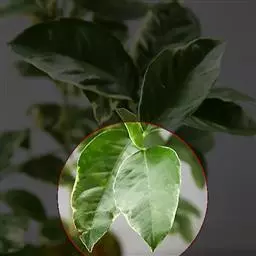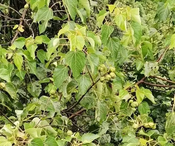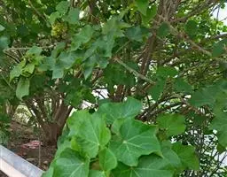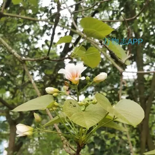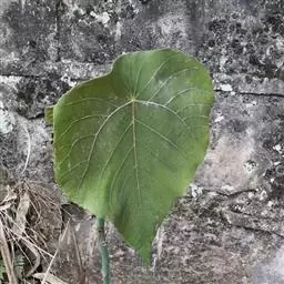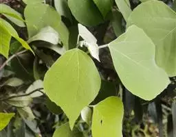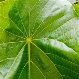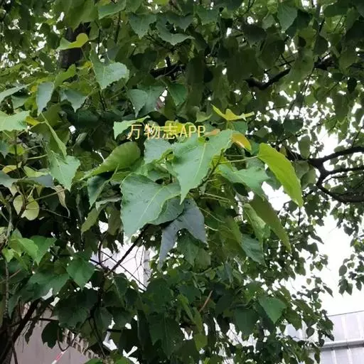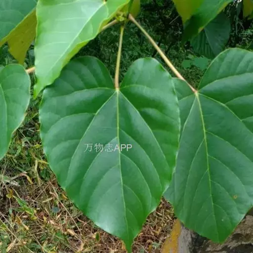 叶卵圆、形,长8-18厘米,宽6-15厘米,顶端短尖,基部截平至浅心形,全缘,稀1-3浅裂,嫩叶上面被很快脱落微柔毛,下面被渐脱落棕褐色微柔毛,成长叶上面深绿色,无毛,下面灰绿色,被贴伏微柔毛;掌状脉5(-7)条;叶柄与叶片近等长,几无毛,顶端有2枚扁平、无柄腺体。