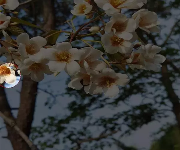 花雌雄同株,先叶或与叶同时开放;花萼长约1厘米,2(-3)裂,外面密被棕褐色微柔毛;花瓣白色,有淡红色脉纹,倒卵形,长2-3厘米,宽1-1.5厘米,顶端圆形,基部爪状;雄花:雄蕊8-12枚,2轮;外轮离生,内轮花丝中部以下合生;雌花:子房密被柔毛,3-5(-8)室,每室有1颗胚珠,花柱与子房室同数,2裂。