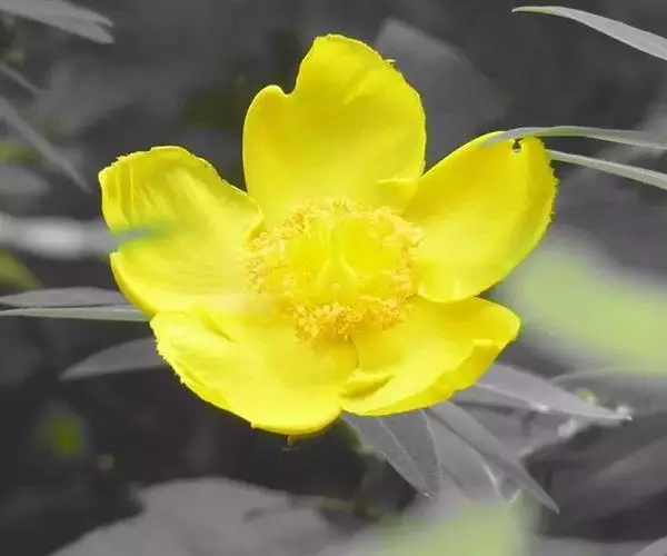 花瓣金黄色,无红晕,多少内弯,长圆状倒卵形至宽倒卵形,长1.2-1.8厘米,宽1-1.4厘米,长约为萼片1.5-2.5倍,边缘全缘或略为啮蚀状小齿,有1行近边缘生的腺点,有侧生的小尖突,小尖突先端多少圆形至消失。雄蕊5束,每束有雄蕊约50-70枚,最长者长7-12毫米,长约为花瓣的2/5-1/2,花药亮黄色。
