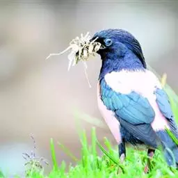 粉红椋鸟是雀形目椋鸟科粉红椋鸟属鸟类。头顶具紫色羽冠;头部、颈、颏、喉黑色具蓝紫色金属光泽;背和腹粉红色;两翅和尾黑褐色;虹膜暗褐色;嘴黄色或粉红色,上嘴基部黑色,冬季嘴为褐色;脚黄色。嘴较其他椋鸟短而钝,上嘴弯曲较明显;脚较粗壮,爪发达。粉红椋鸟分布于欧洲东南部、西伯利亚、西亚、印度和斯里兰卡岛等地区,在中国新疆西部和北部、西藏西部、澳门、台湾等地也能看到其身影。栖息于干旱平原、荒漠或半荒漠地区。常成群活动,鸣声嘈杂。主要在地面觅食,以甲虫、蝗虫、毛虫等各种昆虫为食,偶食植物果实和种子。繁殖期5—7月,营巢于岩壁缝隙、树洞中,每窝产卵4—6枚,卵白色或淡蓝色,孵化期13—15天。雏鸟晚成性,由雌雄亲鸟共同喂养。粉红椋鸟种群数量较少,已被列入中国国家林业局2000年8月1日发布的《国家保护的有益的或者有重要经济、科学研究价值的陆生野生动物名录》。