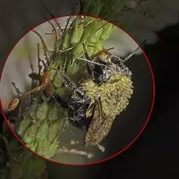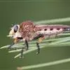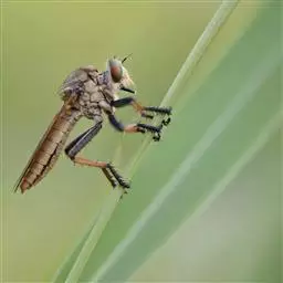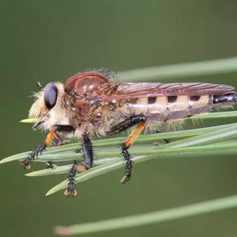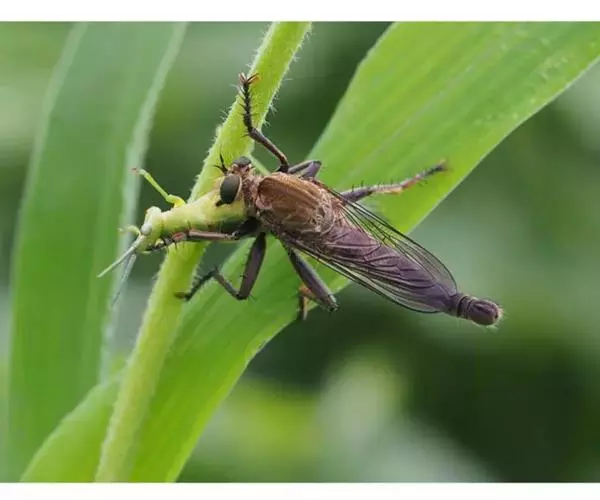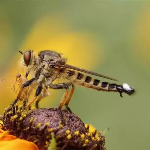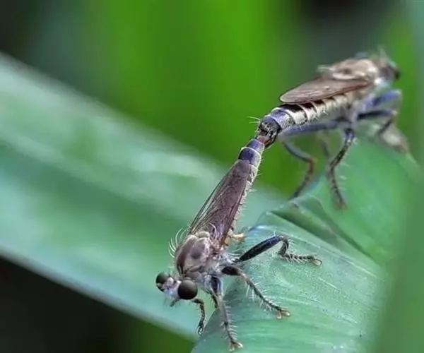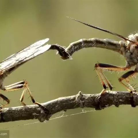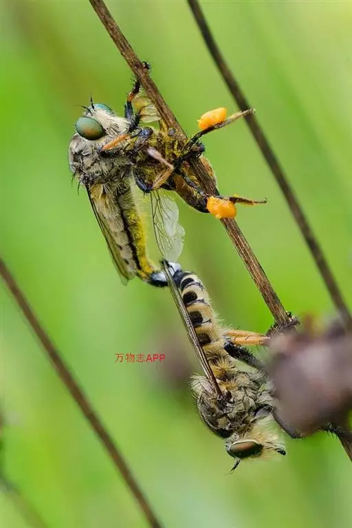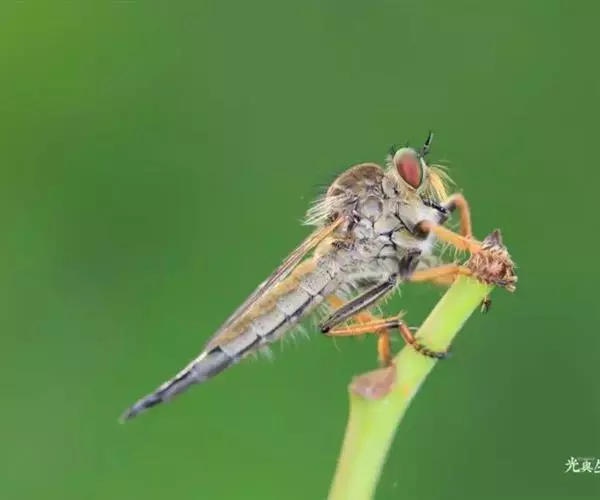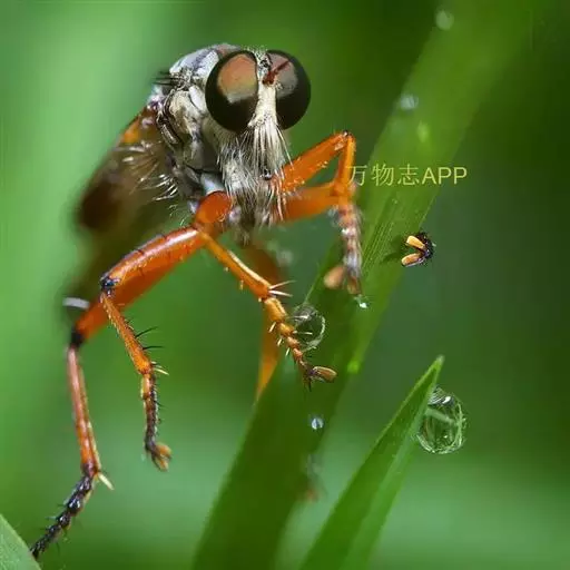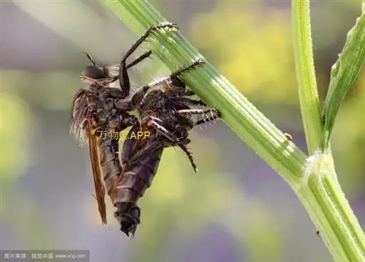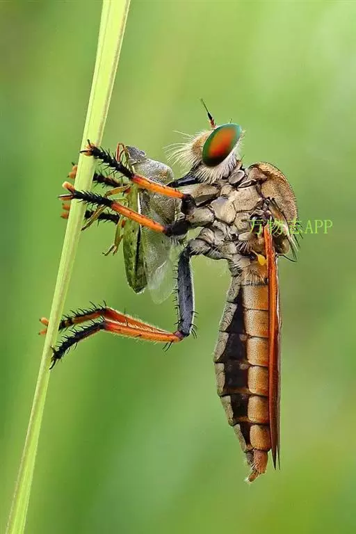 食虫虻的这些特性,使它们成为昆虫世界中的魔鬼。人们在一些恐怖片、电子游戏中也常用它作为模型来塑造角色。图中所示的是一只雄性中华单羽食虫虻捕食斑须蝽。有些雄性食虫虻甚至会把猎物作为“彩礼”送给雌性,期望得到雌性的青睐。食虫虻的幼虫通常是取食植物的。