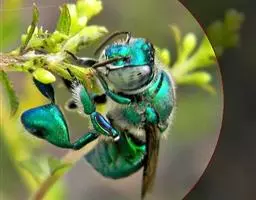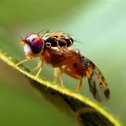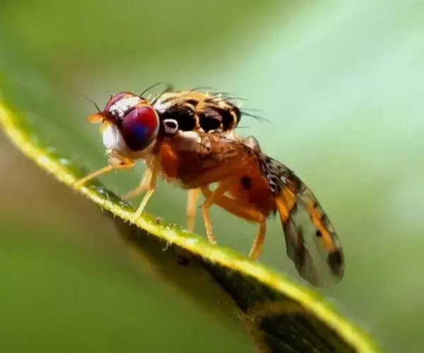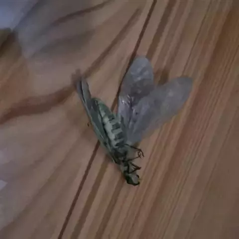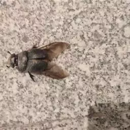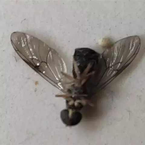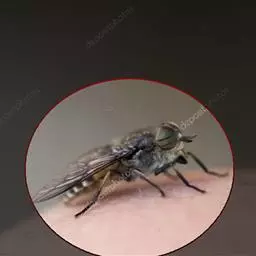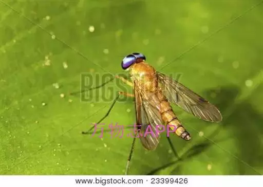 昆虫,形状像蝇而略大,体黑绿色,雄的吸植物的汁液,雌的吸人畜的血液。