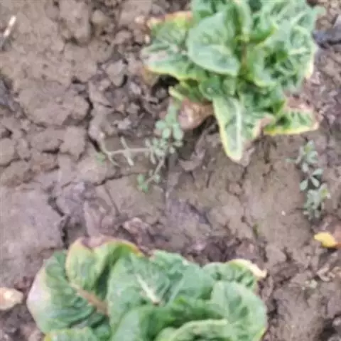 生菜霜霉病 生菜霜霉病为真菌病害,在生菜生长幼苗期、成株期均可发病,以成株期受害最为严重,一般主要危害叶片,病叶由植株下部向上蔓延,最初叶上生淡黄色近圆形多角形病斑,潮湿时,叶背病斑长出白霉即病菌的孢囊梗及孢子囊,有时蔓延到叶片正面,后期病斑枯死变为黄褐色并连接成片,致全叶干枯。防治上一要加强栽培管理,合理密植,适度增加中耕次数,降低田间湿度;适时浇水追肥。二要及早用药。以预防为主,若发现病株及时拔除并带出集中烧毁,同时喷施金雷、72.2%普力克液剂等针对性药剂进行防治。