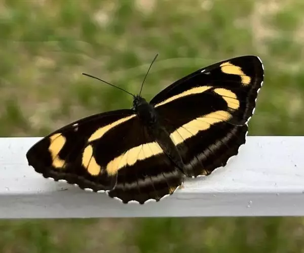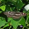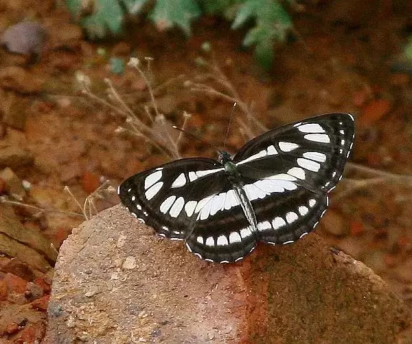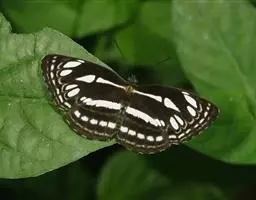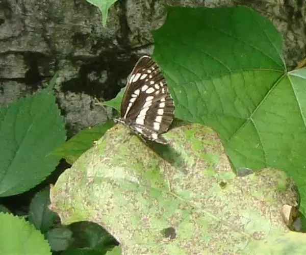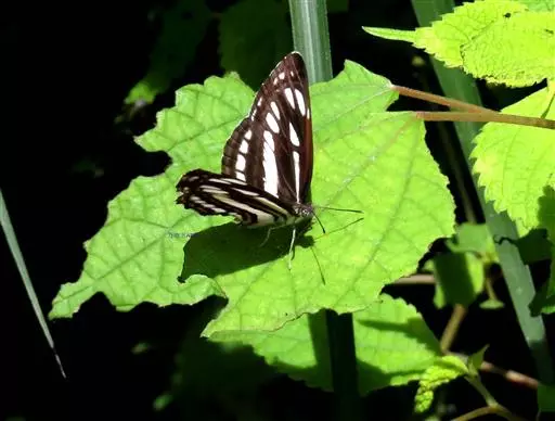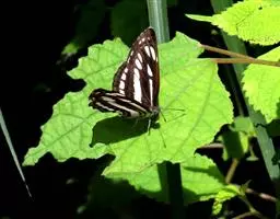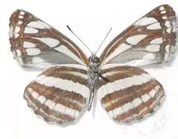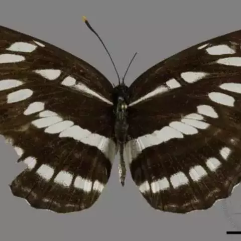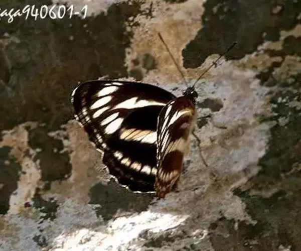 中环蛱蝶 翅展40.0~50.0 mm。体背面黑色,腹面苍黄色。触角顶端黄色。翅表面黑褐色,斑纹白色,外缘波状并有白色缘毛;翅展开时显示3列由大小斑纹组成并两翅相连的白色带。前翅中室内有一条长形纵带,其前方有一个箭头状斑纹。翅下表面黄色或黄褐色,斑纹清晰,周缘有明显的黑线围绕。
