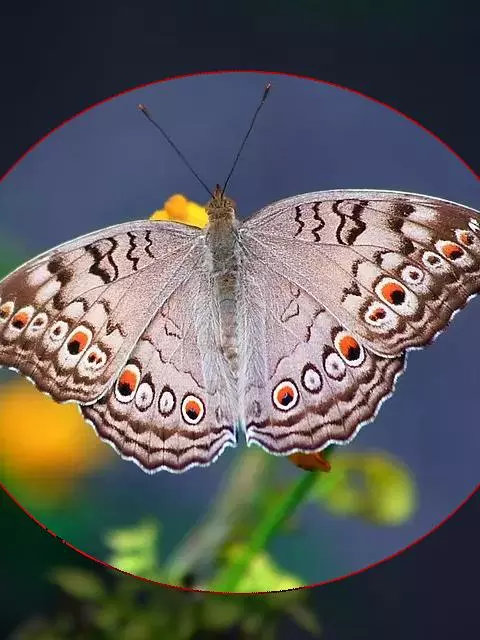 孔雀蛱蝶展翅宽50~60mm。翅膀表面红色,上、下翅有一大型彩色眼纹;翅膀腹面淡褐色,拟似烟熏枯叶…