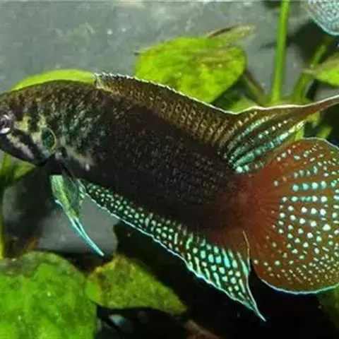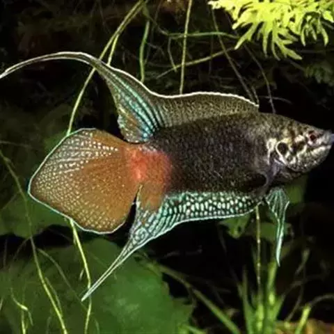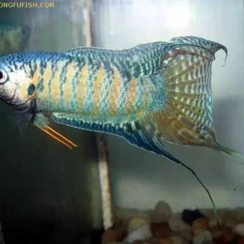 叉尾斗鱼,体形与圆尾斗鱼相似。腹鳍有1根分节鳍条特别延长,雄鱼鳍条延长尤甚,尾鳍叉形。…